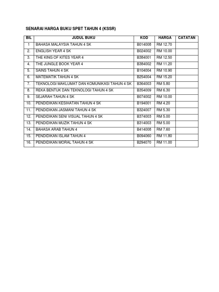 Senarai Harga Buku Kssr Tahun 4