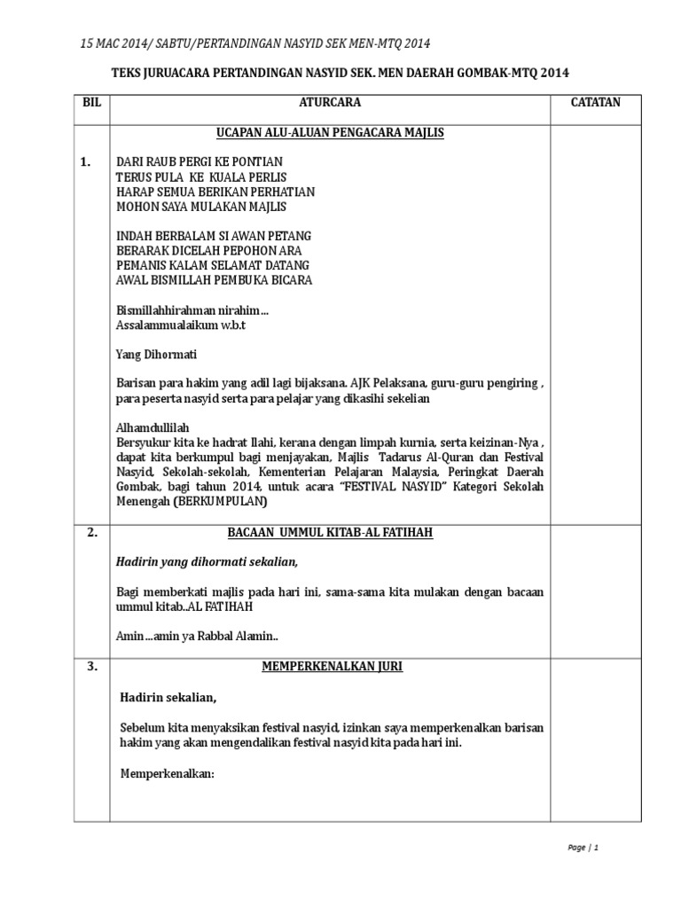 Teks Pengacara Majlis Pertandingan Nasyid Mtq