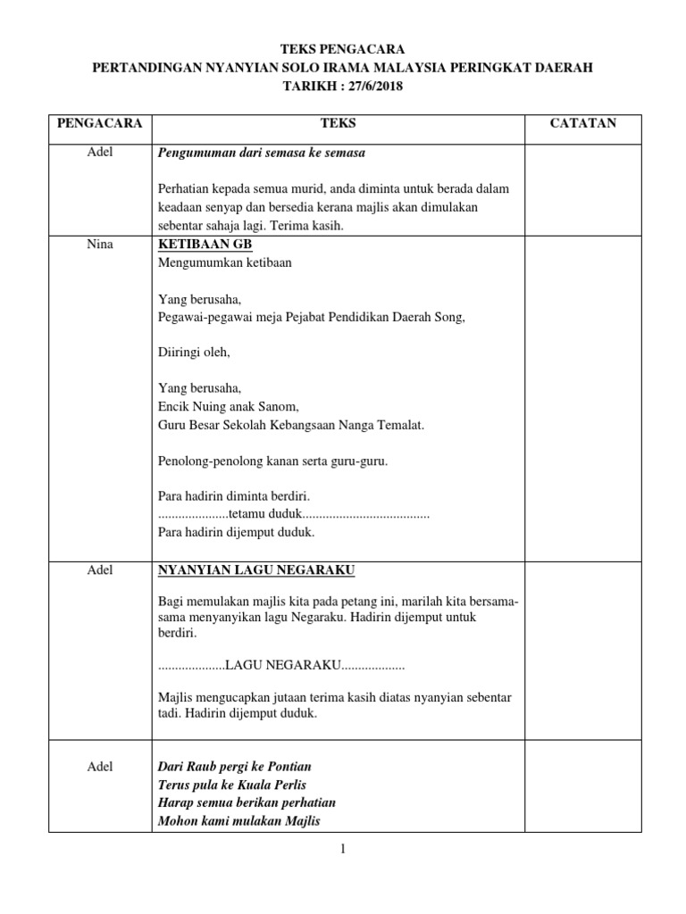 Teks Pengacara Pertandingan Nyanyian Solo Lagu Irama Malaysia Docx
